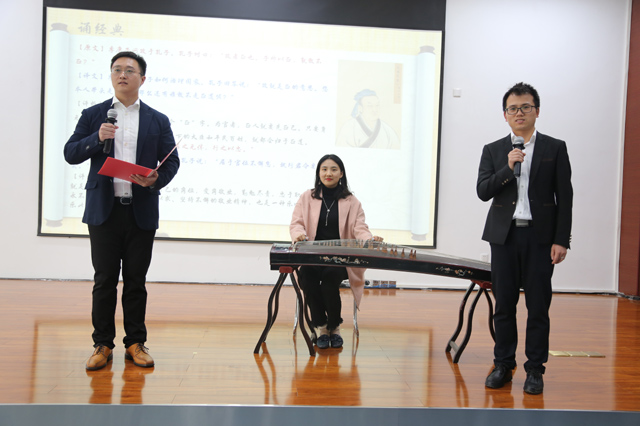 在誦經典環節,整車出口事業部售后服務分部武向東、田江、姚瑤誦讀講解《論語·顏淵》)。